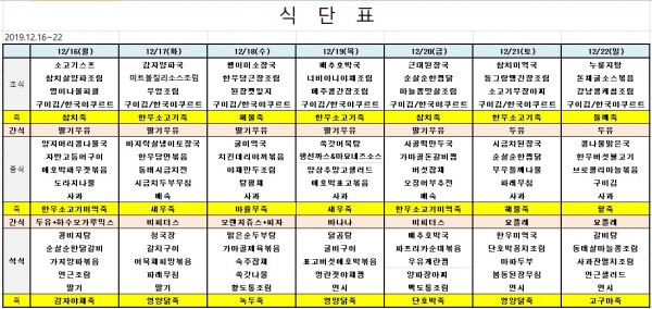 12월 셋째주 식단표 페이지 정보 작성자 은천노인복지회 작성일19-12-15 15:47 조회36,324회 댓글0건 관련링크 이전글 다음글 목록 답변 본문 ※ 모든 식사에는 잡곡밥과 김치가 제공됩니다. ※ 식단은 식재료수급에 의해 변경될 수 있습니다. 이전글 다음글 목록 답변
