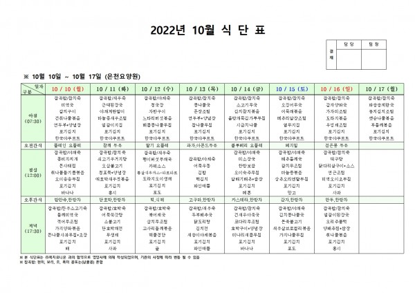 10월 둘째주 식단표 페이지 정보 작성자 은천노인복지회 작성일22-10-06 15:49 조회86,868회 댓글0건 관련링크 이전글 다음글 목록 답변 본문 . 이전글 다음글 목록 답변