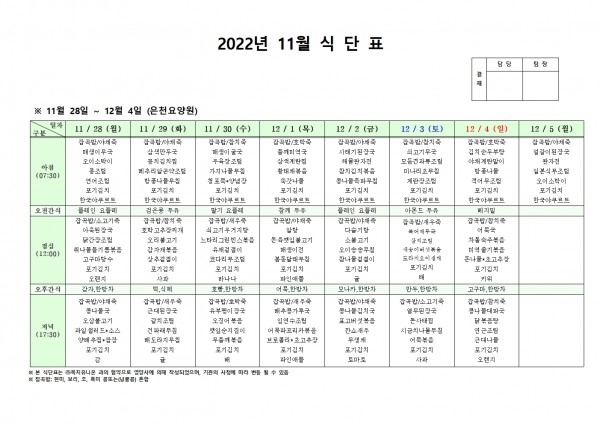 11월 넷째주 식단표 페이지 정보 작성자 은천노인복지회 작성일22-11-24 16:56 조회82,856회 댓글0건 관련링크 이전글 다음글 목록 답변 본문 . 이전글 다음글 목록 답변
