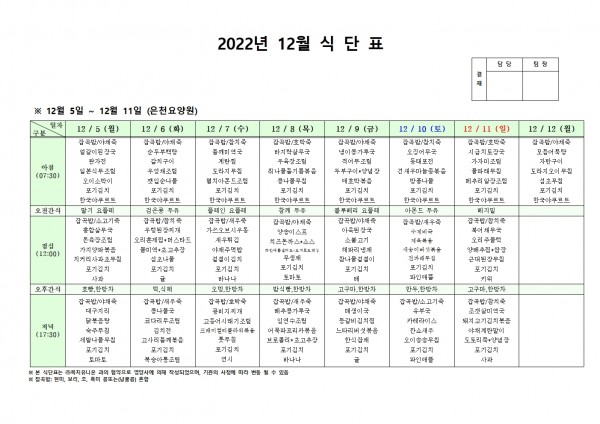 12월 첫째주 식단표 페이지 정보 작성자 은천노인복지회 작성일22-12-01 17:14 조회81,487회 댓글0건 관련링크 이전글 다음글 목록 답변 본문 . 이전글 다음글 목록 답변