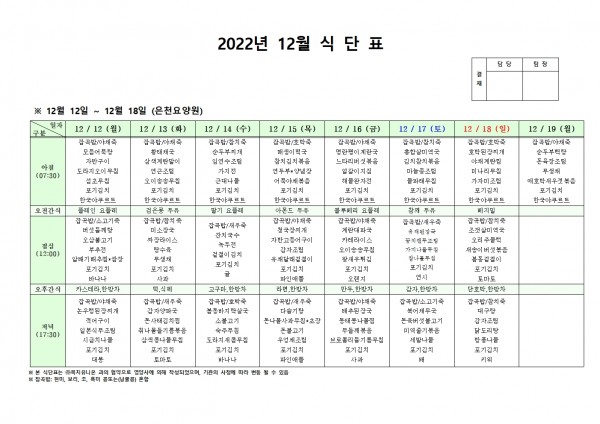 12월 둘째주 식단표 페이지 정보 작성자 은천노인복지회 작성일22-12-08 14:20 조회80,656회 댓글0건 관련링크 이전글 다음글 목록 답변 본문 . 이전글 다음글 목록 답변