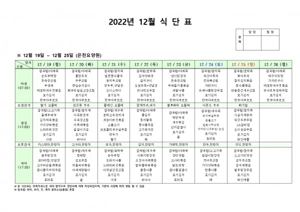 12월 셋째주 식단표 페이지 정보 작성자 은천노인복지회 작성일22-12-16 15:00 조회80,175회 댓글0건 관련링크 이전글 다음글 목록 답변 본문 . 이전글 다음글 목록 답변