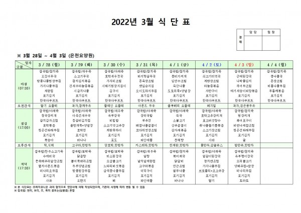 3월 다섯째주 식단표 페이지 정보 작성자 은천노인복지회 작성일22-03-25 10:40 조회104,668회 댓글0건 관련링크 이전글 다음글 목록 답변 본문 . 이전글 다음글 목록 답변