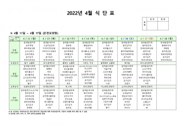 4월 둘째주 식단표 페이지 정보 작성자 은천노인복지회 작성일22-04-11 16:27 조회103,086회 댓글0건 관련링크 이전글 다음글 목록 답변 본문 . 이전글 다음글 목록 답변