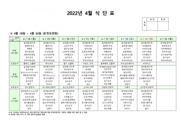 4월 셋째주 식단표 페이지 정보 작성자 은천노인복지회 작성일22-04-14 17:03 조회101,759회 댓글0건 관련링크 이전글 다음글 목록 답변 본문 . 이전글 다음글 목록 답변