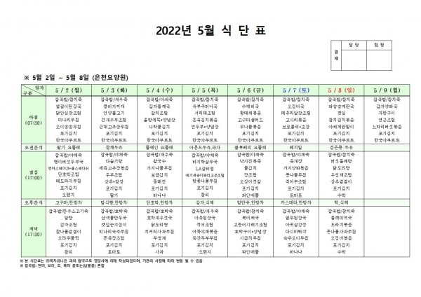 5월 첫째주 식단표 페이지 정보 작성자 은천노인복지회 작성일22-04-29 10:35 조회100,003회 댓글0건 관련링크 이전글 다음글 목록 답변 본문 . 이전글 다음글 목록 답변