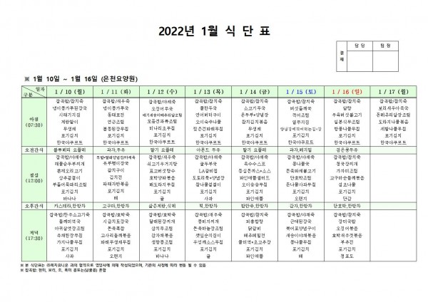 1월 둘째주 식단표 페이지 정보 작성자 은천노인복지회 작성일22-01-07 10:03 조회112,920회 댓글0건 관련링크 이전글 다음글 목록 답변 본문 . 이전글 다음글 목록 답변