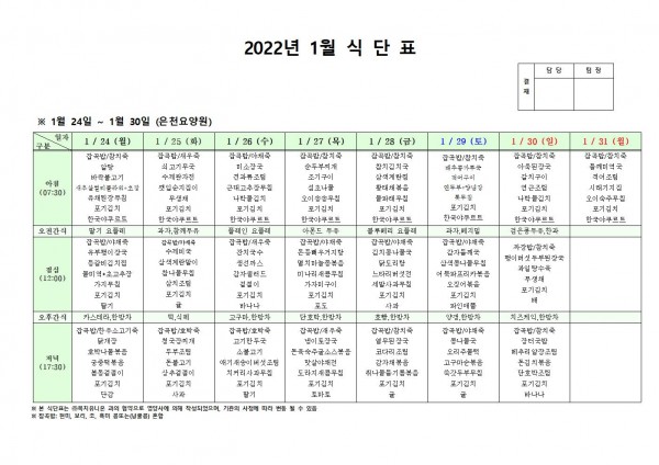1월 넷째주 식단표 페이지 정보 작성자 은천노인복지회 작성일22-01-25 09:24 조회111,897회 댓글0건 관련링크 이전글 다음글 목록 답변 본문 . 이전글 다음글 목록 답변