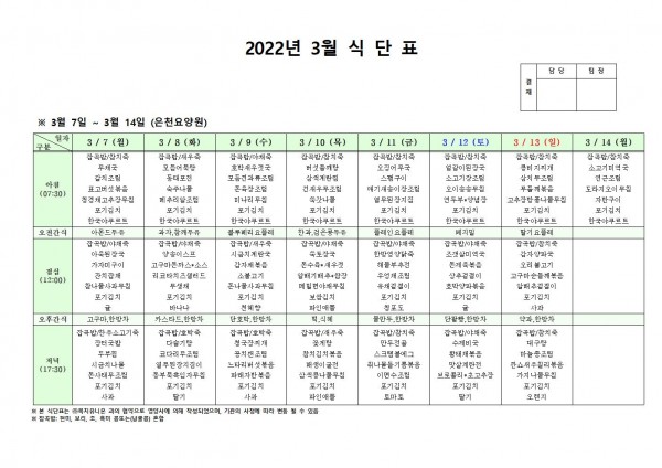 3월 둘째주 식단표 페이지 정보 작성자 은천노인복지회 작성일22-03-04 09:58 조회106,290회 댓글0건 관련링크 이전글 다음글 목록 답변 본문 . 이전글 다음글 목록 답변