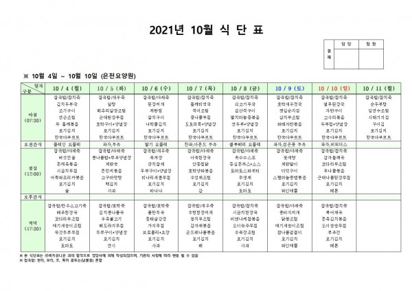 10월 첫째주 식단표 페이지 정보 작성자 은천노인복지회 작성일21-09-30 16:01 조회119,386회 댓글0건 관련링크 이전글 다음글 목록 답변 본문 . 이전글 다음글 목록 답변