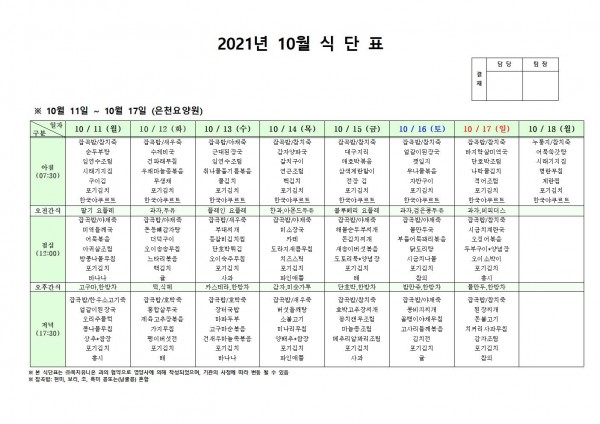 10월 둘째주 식단표 페이지 정보 작성자 은천노인복지회 작성일21-10-12 10:03 조회118,669회 댓글0건 관련링크 이전글 다음글 목록 답변 본문 . 이전글 다음글 목록 답변