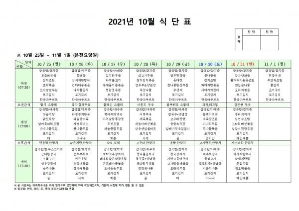 10월 넷째주 식단표 페이지 정보 작성자 은천노인복지회 작성일21-10-26 08:56 조회118,094회 댓글0건 관련링크 이전글 다음글 목록 답변 본문 . 이전글 다음글 목록 답변