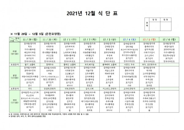 12월 첫째주 식단표 페이지 정보 작성자 은천노인복지회 작성일21-11-25 17:12 조회116,545회 댓글0건 관련링크 이전글 다음글 목록 답변 본문 . 이전글 다음글 목록 답변