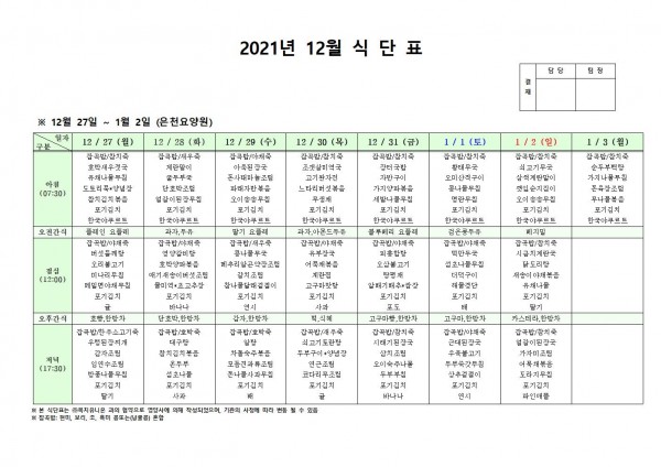 12월 다섯째주 식단표 페이지 정보 작성자 은천노인복지회 작성일21-12-23 17:14 조회114,129회 댓글0건 관련링크 이전글 다음글 목록 답변 본문 . 이전글 다음글 목록 답변