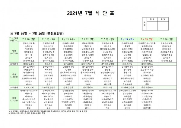 7월 셋째주 식단표 페이지 정보 작성자 은천노인복지회 작성일21-07-22 11:18 조회124,618회 댓글0건 관련링크 이전글 다음글 목록 답변 본문 . 이전글 다음글 목록 답변