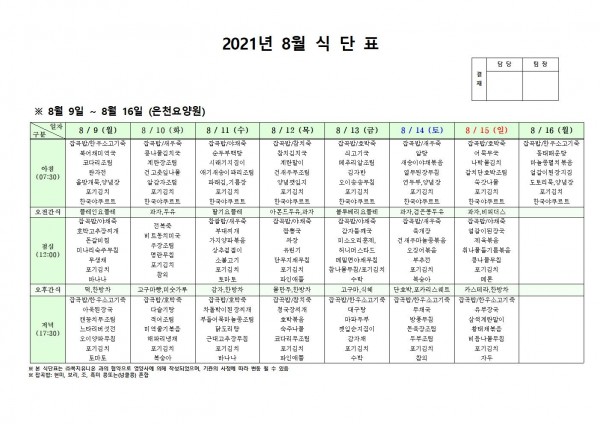 8월 둘째주 식단표 페이지 정보 작성자 은천노인복지회 작성일21-08-12 15:05 조회123,820회 댓글0건 관련링크 이전글 다음글 목록 답변 본문 . 이전글 다음글 목록 답변
