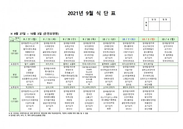 9월 넷째주 식단표 페이지 정보 작성자 은천노인복지회 작성일21-09-30 16:00 조회119,661회 댓글0건 관련링크 이전글 다음글 목록 답변 본문 . 이전글 다음글 목록 답변