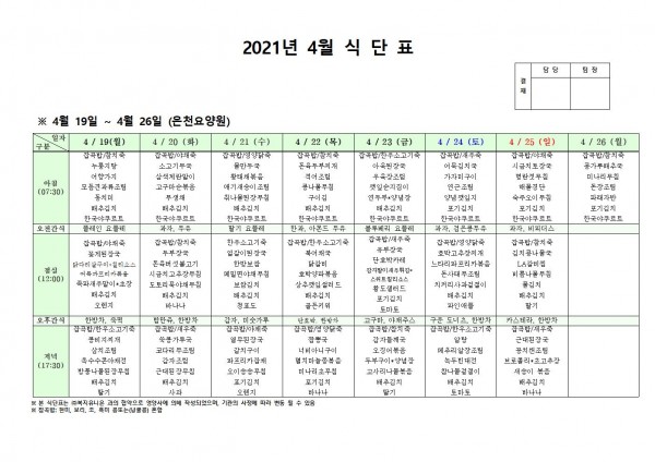 4월 셋째주 식단표 페이지 정보 작성자 은천노인복지회 작성일21-04-15 19:35 조회132,342회 댓글0건 관련링크 이전글 다음글 목록 답변 본문 4월 셋째주 식단표 이전글 다음글 목록 답변