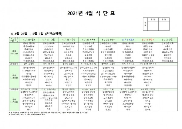 4월 넷째주 식단표 페이지 정보 작성자 은천노인복지회 작성일21-04-22 18:32 조회130,463회 댓글0건 관련링크 이전글 다음글 목록 답변 본문 식단표 이전글 다음글 목록 답변