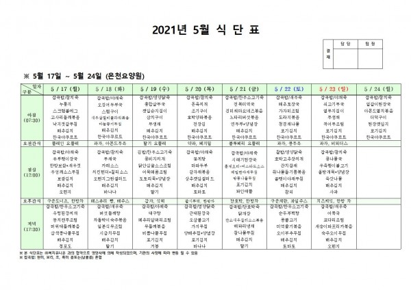 5월 셋째주 식단표 페이지 정보 작성자 은천노인복지회 작성일21-05-13 19:27 조회128,646회 댓글0건 관련링크 이전글 다음글 목록 답변 본문 5월 셋째주 식단표 이전글 다음글 목록 답변