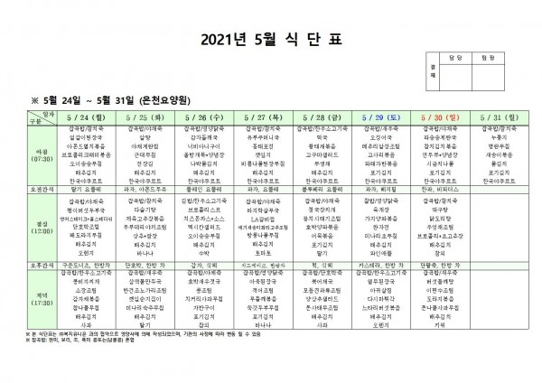 5월 넷째 주 식단표 페이지 정보 작성자 은천노인복지회 작성일21-05-21 16:38 조회127,883회 댓글0건 관련링크 이전글 다음글 목록 답변 본문 5월 넷째 주 식단표 이전글 다음글 목록 답변