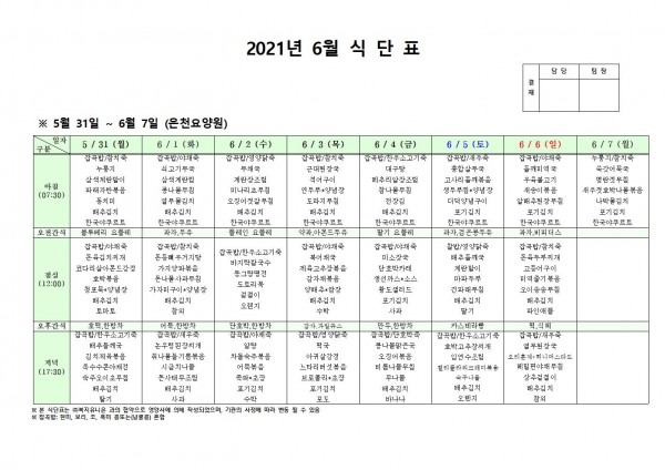 6월 첫째주 식단표 페이지 정보 작성자 은천노인복지회 작성일21-05-28 09:47 조회126,872회 댓글0건 관련링크 이전글 다음글 목록 답변 본문 . 이전글 다음글 목록 답변