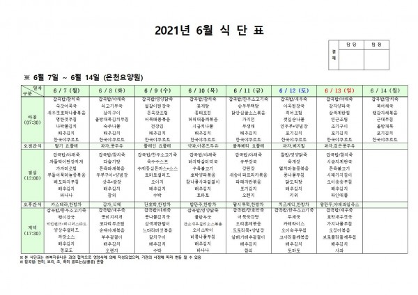 6월 둘째주 식단표 페이지 정보 작성자 은천노인복지회 작성일21-06-03 17:20 조회126,703회 댓글0건 관련링크 이전글 다음글 목록 답변 본문 . 이전글 다음글 목록 답변