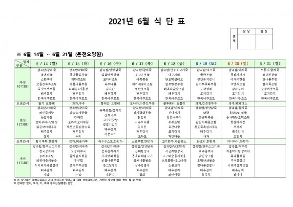 6월 셋째주 식단표 페이지 정보 작성자 은천노인복지회 작성일21-06-11 10:28 조회126,204회 댓글0건 관련링크 이전글 다음글 목록 답변 본문 . 이전글 다음글 목록 답변