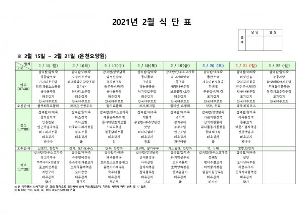 2월 셋째주 식단표 페이지 정보 작성자 은천노인복지회 작성일21-02-15 14:12 조회138,769회 댓글0건 관련링크 이전글 다음글 목록 답변 본문 2월 식단표 [이 게시물은 은천노인복지회님에 의해 2021-03-12 17:18:24 공지사항에서 이동 됨] 이전글 다음글 목록 답변