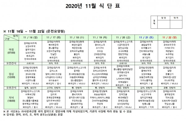 11월 셋째주 식단표 페이지 정보 작성자 은천노인복지회 작성일20-12-08 18:10 조회147,344회 댓글0건 관련링크 이전글 다음글 목록 답변 본문 . 이전글 다음글 목록 답변
