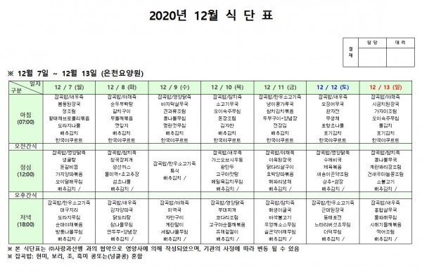 12월 둘째주 식단표 페이지 정보 작성자 은천노인복지회 작성일20-12-08 18:11 조회145,836회 댓글0건 관련링크 이전글 다음글 목록 답변 본문 . 이전글 다음글 목록 답변