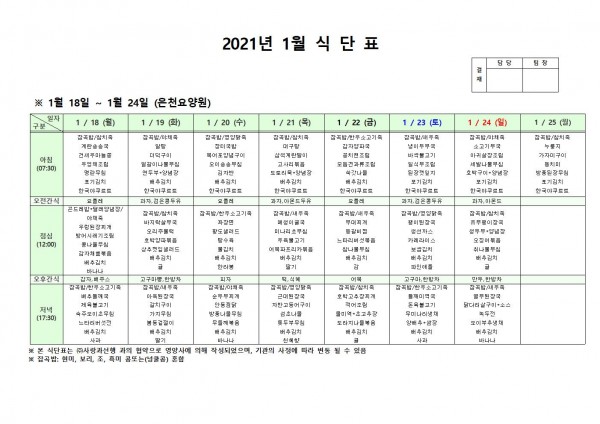 1월 셋째주 식단표 페이지 정보 작성자 은천노인복지회 작성일21-01-15 10:02 조회140,342회 댓글0건 관련링크 이전글 다음글 목록 답변 본문 . 이전글 다음글 목록 답변