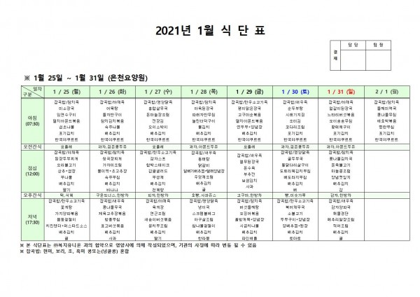 1월 넷째주 식단표 페이지 정보 작성자 은천노인복지회 작성일21-01-22 10:43 조회140,610회 댓글0건 관련링크 이전글 다음글 목록 답변 본문 . 이전글 다음글 목록 답변
