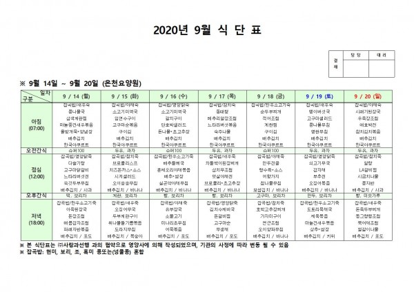 9월 셋째주 식단표 페이지 정보 작성자 은천노인복지회 작성일20-09-22 13:11 조회153,795회 댓글0건 관련링크 이전글 다음글 목록 답변 본문 . 이전글 다음글 목록 답변