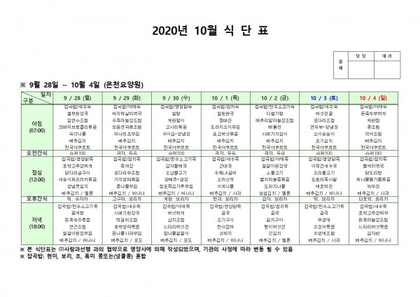 10월 첫째주 식단표 페이지 정보 작성자 은천노인복지회 작성일20-10-12 14:45 조회152,244회 댓글0건 관련링크 이전글 다음글 목록 답변 본문 . 이전글 다음글 목록 답변