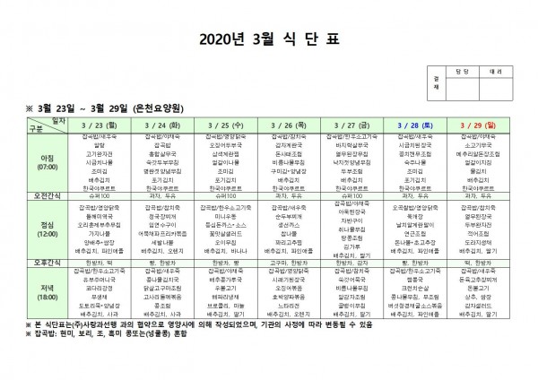 3월 넷째주 식단표 페이지 정보 작성자 은천노인복지회 작성일20-03-31 16:09 조회171,860회 댓글0건 관련링크 이전글 다음글 목록 답변 본문 . 이전글 다음글 목록 답변