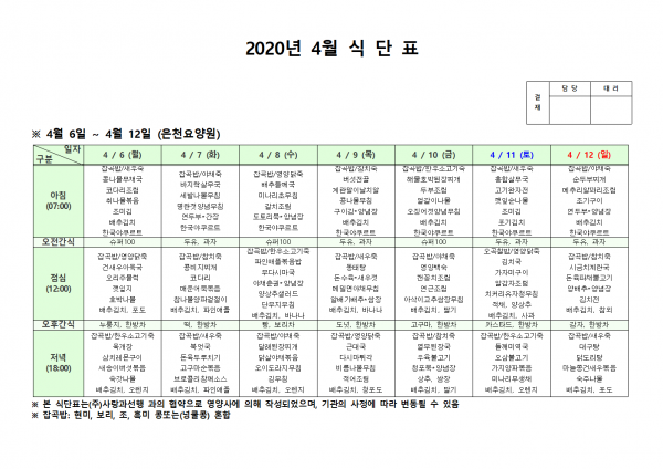 4월 첫째주 식단표 페이지 정보 작성자 은천노인복지회 작성일20-04-13 15:04 조회170,437회 댓글0건 관련링크 이전글 다음글 목록 답변 본문 . 이전글 다음글 목록 답변