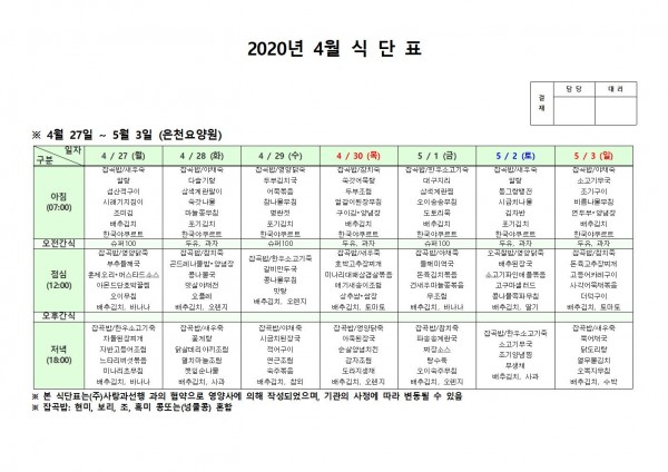 4월 넷째주 식단표 페이지 정보 작성자 은천노인복지회 작성일20-05-04 15:11 조회166,770회 댓글0건 관련링크 이전글 다음글 목록 답변 본문 . 이전글 다음글 목록 답변