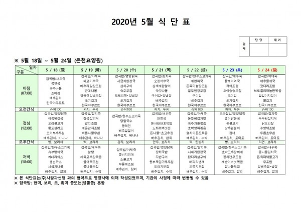 5월 셋째주 식단표 페이지 정보 작성자 은천노인복지회 작성일20-05-26 12:00 조회163,236회 댓글0건 관련링크 이전글 다음글 목록 답변 본문 . 이전글 다음글 목록 답변