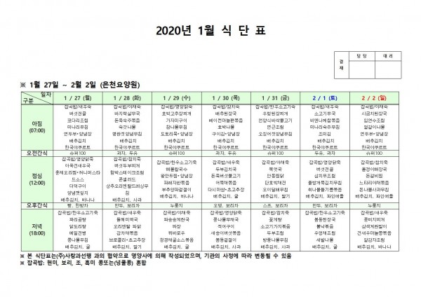 1월 넷째주 식단표 페이지 정보 작성자 은천노인복지회 작성일20-02-04 09:37 조회175,803회 댓글0건 관련링크 이전글 다음글 목록 답변 본문 1월 넷째주 식단표입니다. 이전글 다음글 목록 답변
