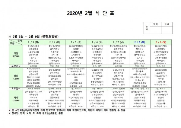 2월 첫째주 식단표 페이지 정보 작성자 은천노인복지회 작성일20-02-11 10:22 조회174,433회 댓글0건 관련링크 이전글 다음글 목록 답변 본문 . 이전글 다음글 목록 답변