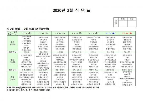 2월 둘째주 식단표 페이지 정보 작성자 은천노인복지회 작성일20-02-17 10:27 조회173,518회 댓글0건 관련링크 이전글 다음글 목록 답변 본문 ㅇㅅㅇ 이전글 다음글 목록 답변