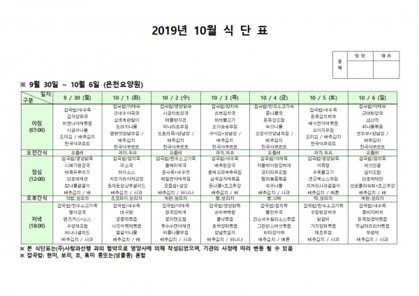 10월 첫째주 식단표 페이지 정보 작성자 은천노인복지회 작성일19-10-07 15:21 조회186,072회 댓글0건 관련링크 이전글 다음글 목록 답변 본문 10월 첫째주 식단표 이전글 다음글 목록 답변
