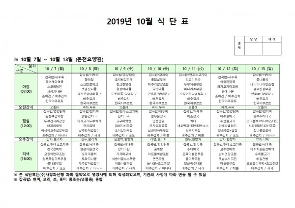 10월 둘째주 식단표 페이지 정보 작성자 은천노인복지회 작성일19-10-14 14:26 조회186,096회 댓글0건 관련링크 이전글 다음글 목록 답변 본문 10월 둘째주 식단표 이전글 다음글 목록 답변