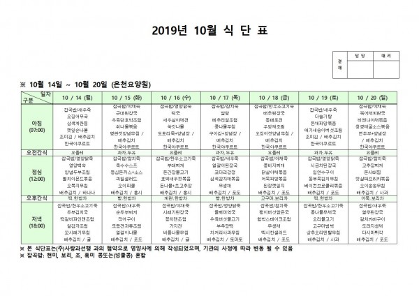 10월 셋째주 식단표 페이지 정보 작성자 은천노인복지회 작성일19-10-21 15:50 조회184,888회 댓글0건 관련링크 이전글 다음글 목록 답변 본문 10월 셋째주 식단표 이전글 다음글 목록 답변