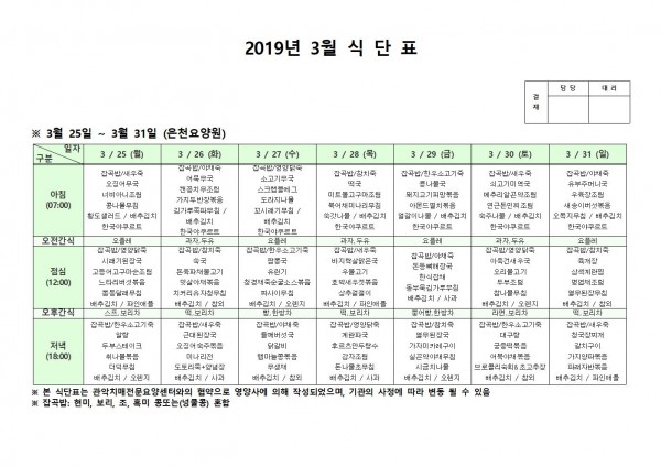 3월 넷째주 식단표 페이지 정보 작성자 은천노인복지회 작성일19-04-01 11:06 조회196,837회 댓글0건 관련링크 이전글 다음글 목록 답변 본문 3월 넷째주 식단표 이전글 다음글 목록 답변
