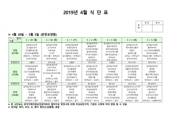 4월 다섯째주 식단표 페이지 정보 작성자 은천노인복지회 작성일19-05-07 14:13 조회196,659회 댓글0건 관련링크 이전글 다음글 목록 답변 본문 4월 다섯째주 식단표 이전글 다음글 목록 답변