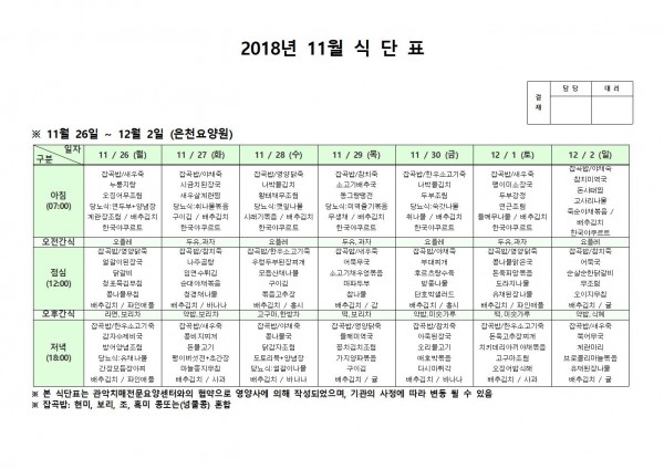 11월 4주째 식단표 페이지 정보 작성자 은천노인복지회 작성일18-12-07 09:38 조회200,896회 댓글0건 관련링크 이전글 다음글 목록 답변 본문 11월 4주째 식단표 이전글 다음글 목록 답변