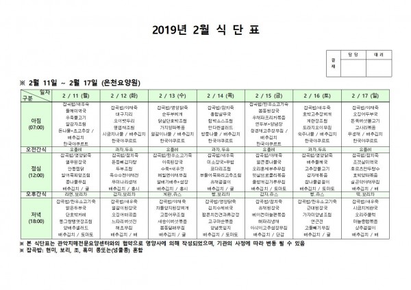 2월 둘째주 식단표 페이지 정보 작성자 은천노인복지회 작성일19-02-13 17:30 조회199,184회 댓글0건 관련링크 이전글 다음글 목록 답변 본문 2월 둘째주 식단표 이전글 다음글 목록 답변