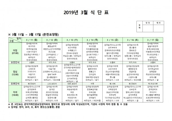 3월 둘째주 식단표 페이지 정보 작성자 은천노인복지회 작성일19-03-18 10:09 조회197,693회 댓글0건 관련링크 이전글 다음글 목록 답변 본문 3월 둘째주 식단표 이전글 다음글 목록 답변
